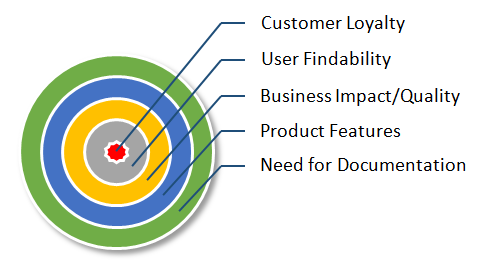 The following is the dartboard approach for your reference. Note that irrespective of what documents you plan, customer loyalty and user findability will always represent the two innermost concentric circles: